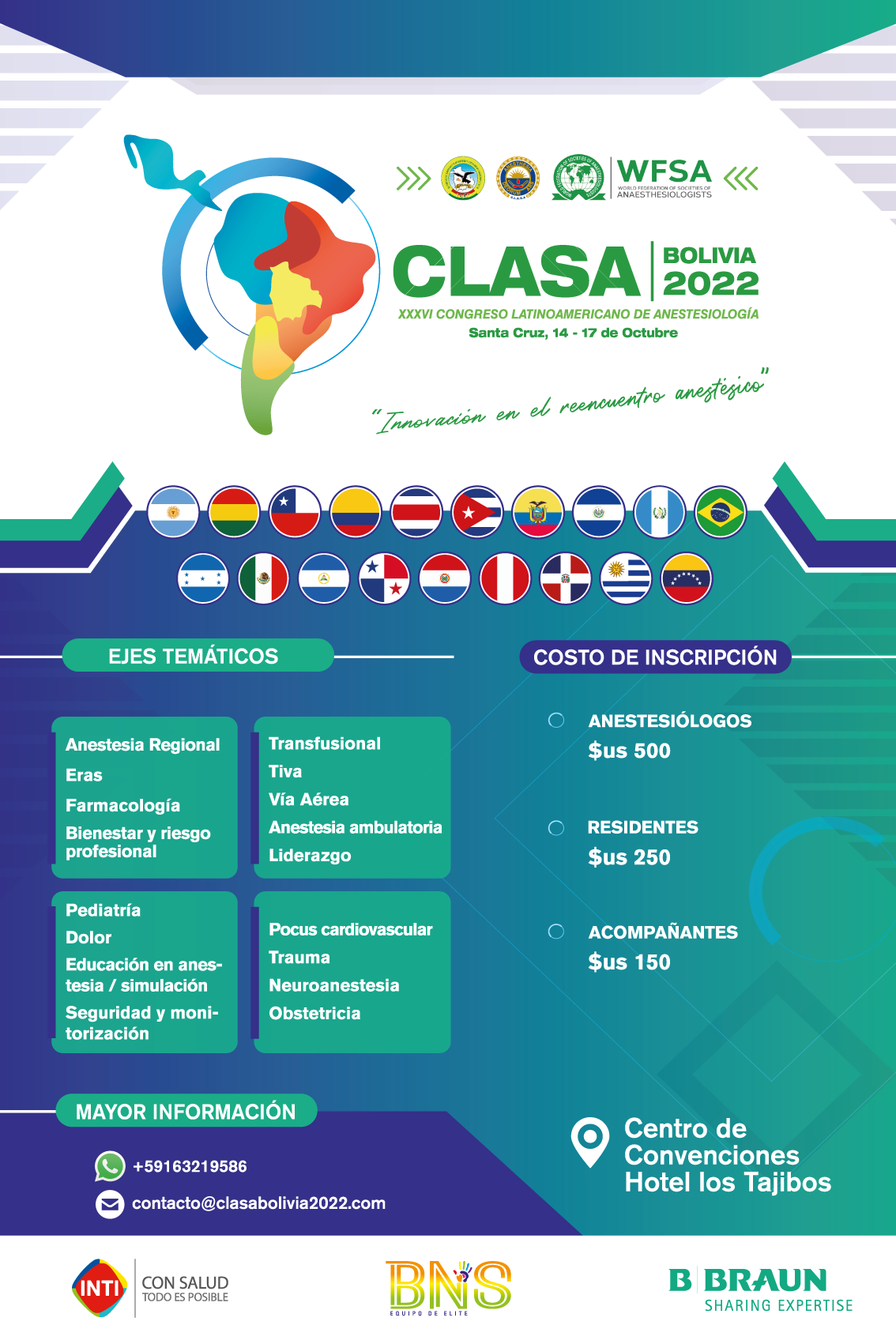 Es el Congreso de la CONFEDERACION LATINOAMERICANA DE SOCIEDADES DE ANESTESIOLOGÍA, es el mayor evento internacional de Latinoamérica, que fortalece los vínculos personales, académicos y profesionales entre anestesiólogos. Se reunirán las representaciones de Latinoamérica en asamblea y se contará con exposiciones magistrales de profesionales que muestran avances científicos de anestesiólogos a nivel latinoamericano y del mundo.